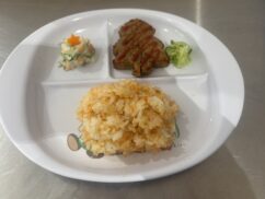 この日のメニューは、ハンバーグ、ポテトサラダ、夕やけごはんでした。