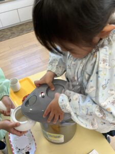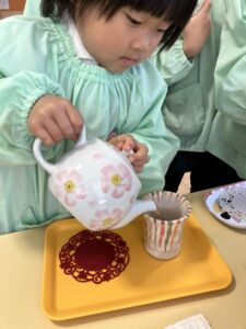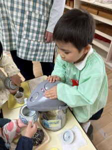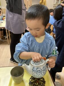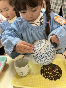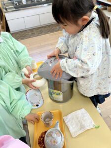 おとうばんさんは、急須のお茶がなくなったら、ポットから急須にお茶をいれます。